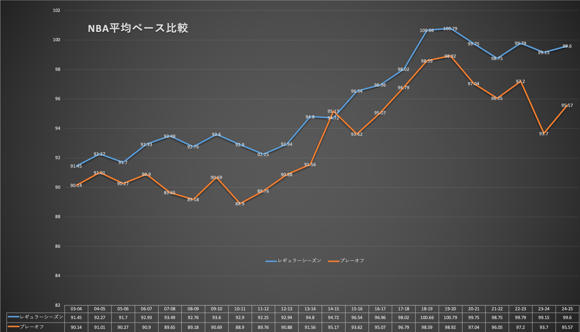 改めて、「ペースとはどういう指標なんですか?」という疑問を持たれた方のためにもう少し詳しく定義を解説します。 NBA トラッキングデータとして示されるペースは48分間で1チームが何回攻めたかという数字です。注意すべきはショットを放った回数ではなく、攻めた回数。たとえばドリブル中にスティールされても、それは1回の攻撃回数としてカウントされます。