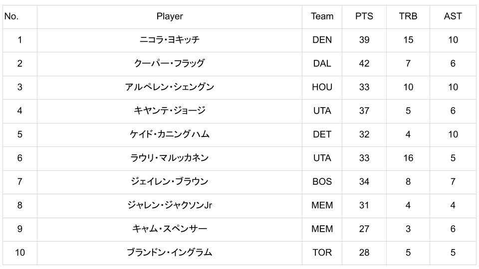 もはや息を吸うようにトリプルダブルを達成するヨキッチ。プレーオフさながらの強度と熱気に包まれたボール・アリーナでチームを勝利に導きました。マッチアップはヨキッチと“同タイプ”のアルペレン・シェングン。シェングンもこの試合で素晴らしい活躍を見せ、こちらも33得点、10リバウンド、10アシストのトリプルダブルを達成しています。第4クォーター終盤のこの2人の勝負は見応え十分で、ヨキッチがシェングンからand1を決めれば、シェングンもヨキッチの上からヨキッチさながらの片足フェイダウェイショットを沈めました。ヨキッチは最終的にオーバータイムでファウルアウトしてしまったものの、ジャマール・マレーも35得点を記録するなど躍動し接戦をものにしました。