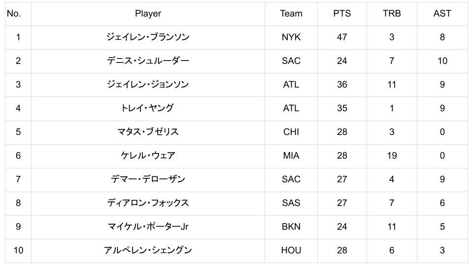 意外にもこの試合でマディソン・スクエア・ガーデンではキャリアハイとなる47得点をあげたブランソンは、名門ニックスの歴史において45得点以上を記録した試合数でバーナード・キングに並び、球団史上1位タイとなりました。警戒して待ち構えるヒートディフェンスに対してドライブからプルアップや決して簡単ではないフローターを次々と沈めたブランソン。さらに特筆すべきはこの試合はターンオーバーを1度も犯さなかったことであり、ブランソンは今シーズンのNBAで、40得点以上・5アシスト以上・ターンオーバー0を同時に記録した初の選手となりました。