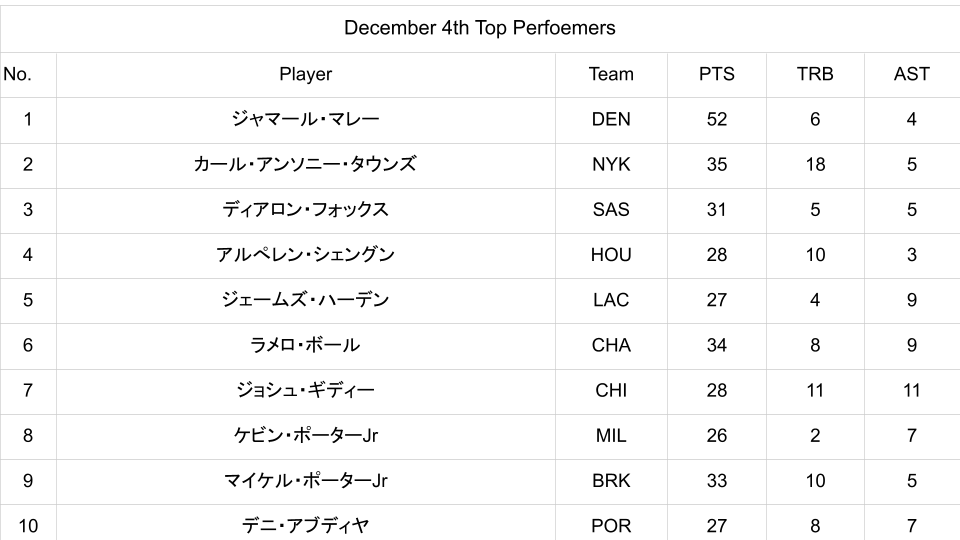 デンバー・ナゲッツはクリスチャン・ブラウン、アーロン・ゴードンの2人が揃って離脱した日本時間11月23日以降、それまでの12勝3敗から、昨日までの直近5試合で2勝3敗とペースが落ちていました。そんな中ジャマール・マレーは昨日のインディアナ・ペイサーズ戦で以下のスタッツを記録しました。