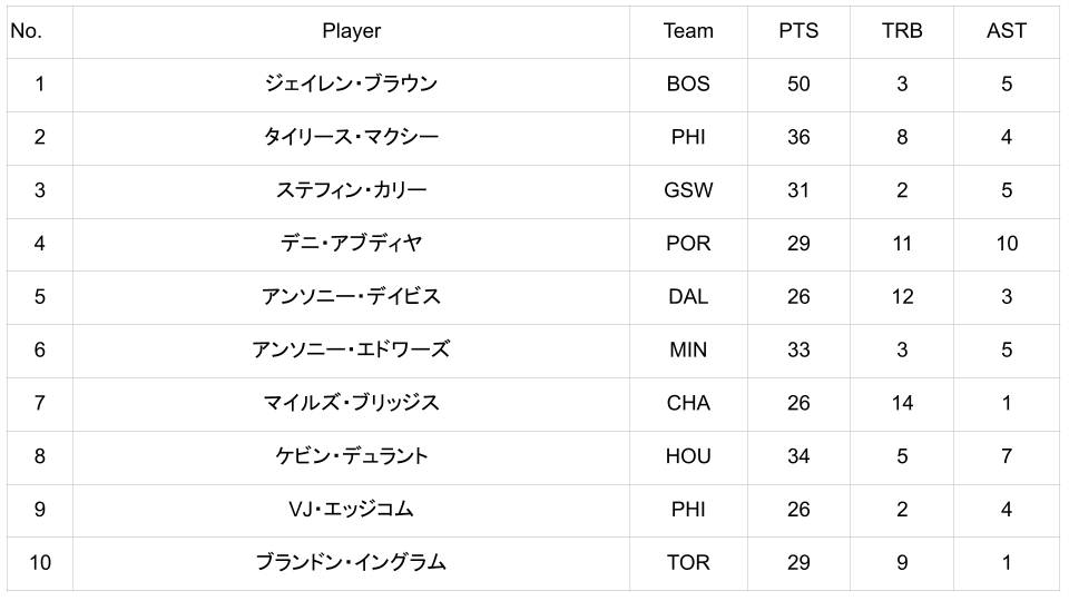 ・50得点(FG成功率69.2% 18/26本)(3ポイント成功率60% 6/10本)