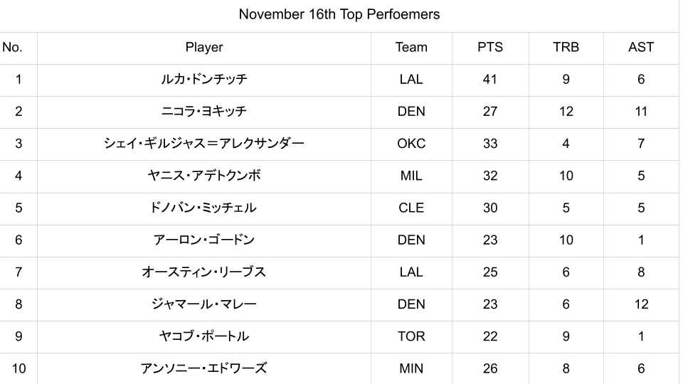 ①11/16レギュラーシーズンゲーム試合結果 昨日行われた試合の結果はこちらです