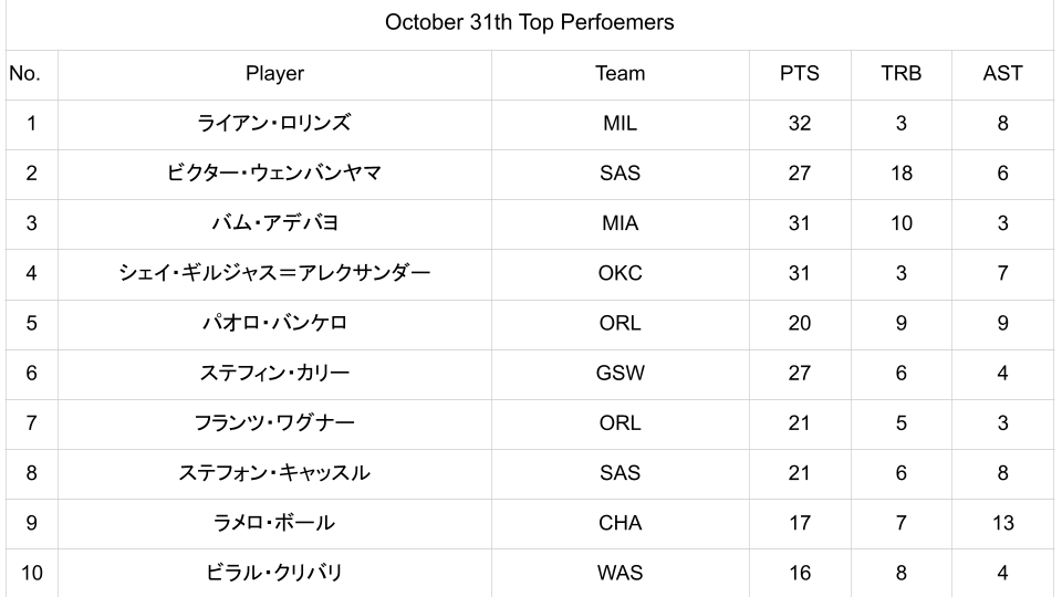 ①10/31レギュラーシーズンゲーム試合結果 昨日行われた試合の結果はこちらです