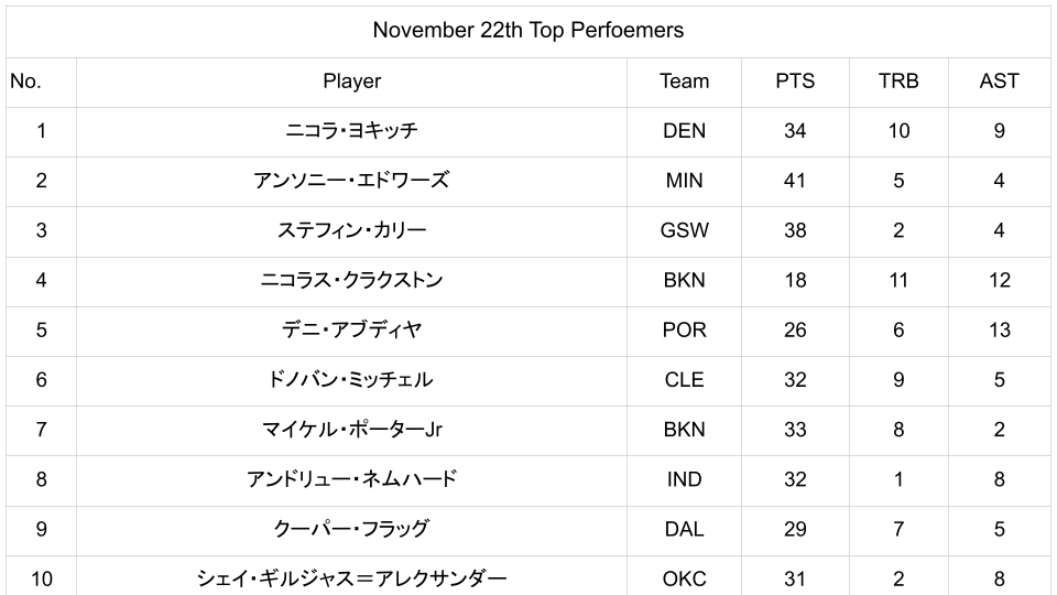 昨季に比べ、6点以上高い平均24.8得点をここまで記録しているポーターJr。ナゲッツではヨキッチにいわば「使われる選手」としてプレーしていましたが、ネッツ加入後は自身が1stオプションとなり得点を重ねています。昨季は77試合に出場し、30得点以上を記録したのは3回でしたが、今季は開幕から14試合ですでに5回記録しています。208cmの長身から放たれる滞空時間の長いアウトサイドショットは非常に強力で、昨日の試合でもハンドオフからボールを受け取り、トップから多くのショットを成功させました。ネッツは他にもニック・クラクストンがキャリアハイの12アシストを含むトリプルダブルを記録しており、アウェーで臨んだ2024年の王者、セルティックス相手に勝利を収めることに貢献しました。