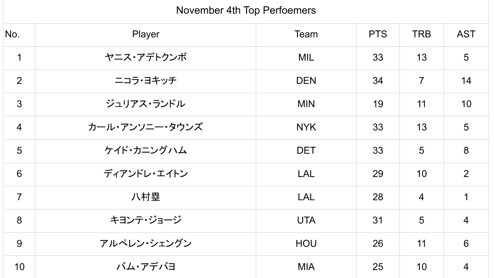 ①11/4 試合結果 “日本の至宝が大活躍” ②週間MVP発表! ③ドラ2ルーキーが数週間の離脱見込み ④ザイオンの速報