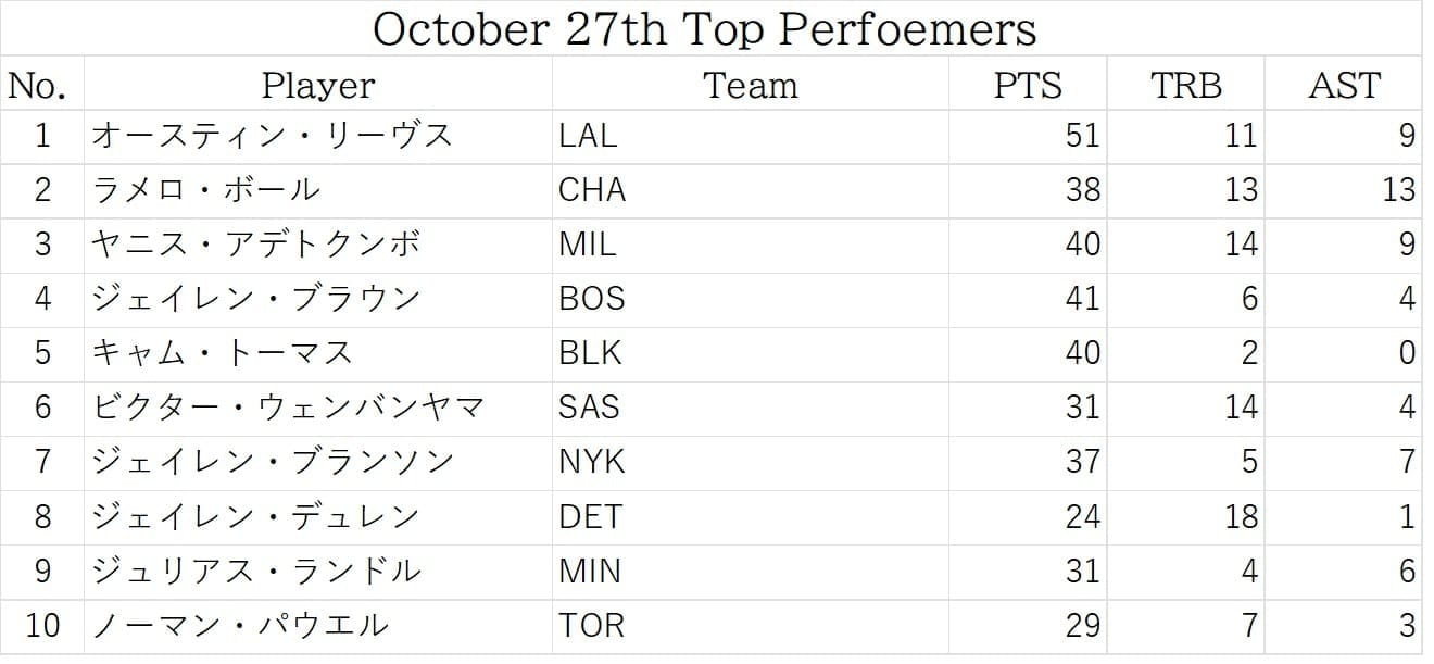 ①10/27レギュラーシーズンゲーム試合結果 昨日行われた試合の結果はこちらです