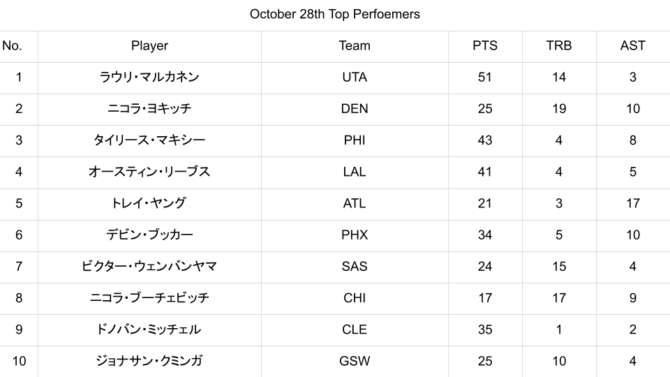 ①10/28試合結果 今季4人目の50得点 ②週間MVP発表 ③ダンク王者、ついに契約 ④プレーオフ進出に関する意外なデータ?