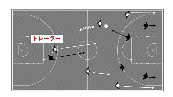 ドラッグスクリーンの語源と動き 「トレーラー」とは、ボールを持って速く攻め上がるボールハンドラーに対し、遅れて後方から駆け上がる選手のことを指します。